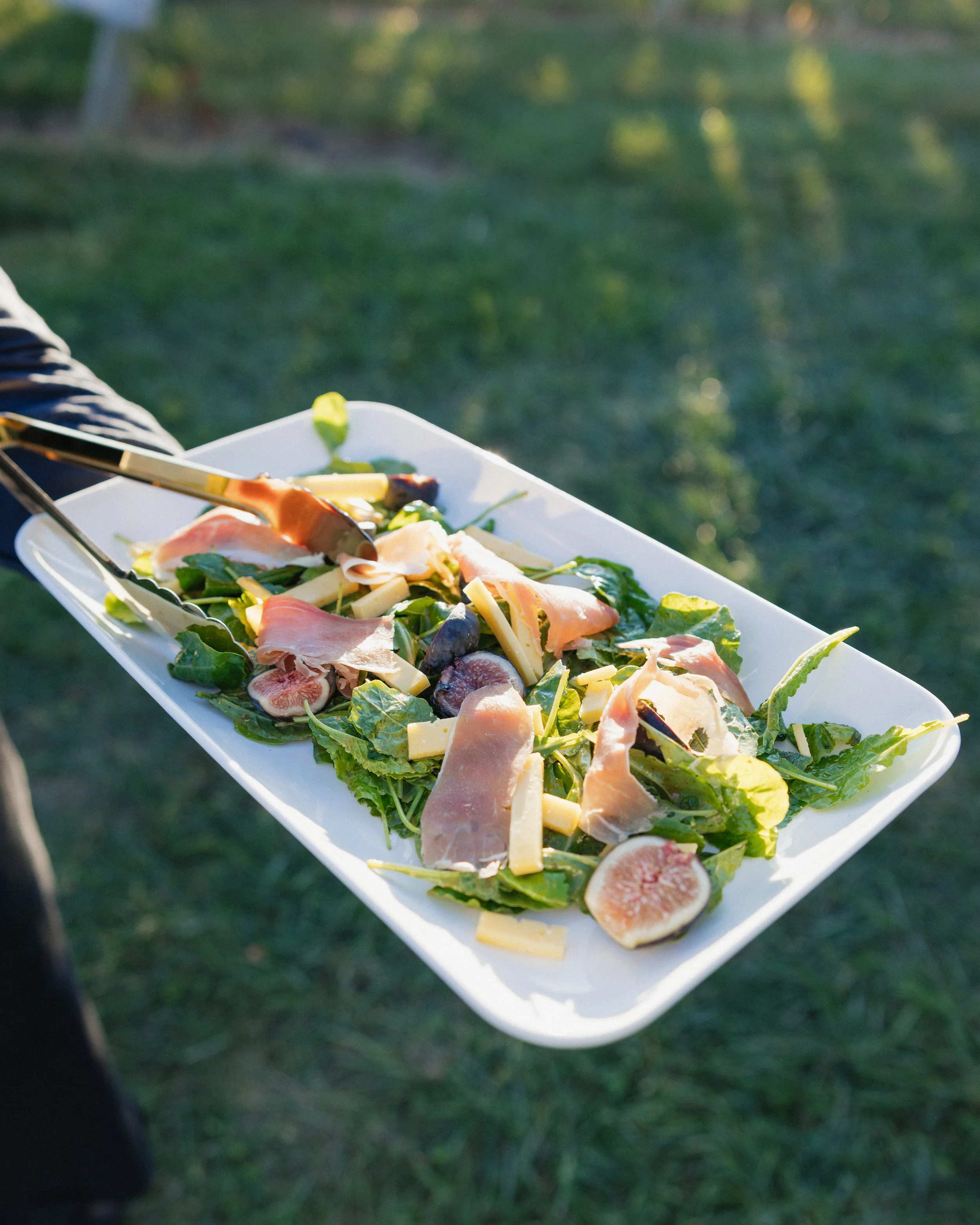 Upon arrival, guests gathered in the shade of a grove of oak trees, where we had stations set with perfectly paired bites. Each of the three chef-crafted canapés were designed to pair with a Flying Fox wine or vermouth. This label is a bit more playful than its refined big sister, Veritas, which we served at dinner. The irreverent label gives Afton family a chance to play with Virginia’s terroir outside of convention, incorporating flavors beyond the grape to create vermouth, amaro, and more.